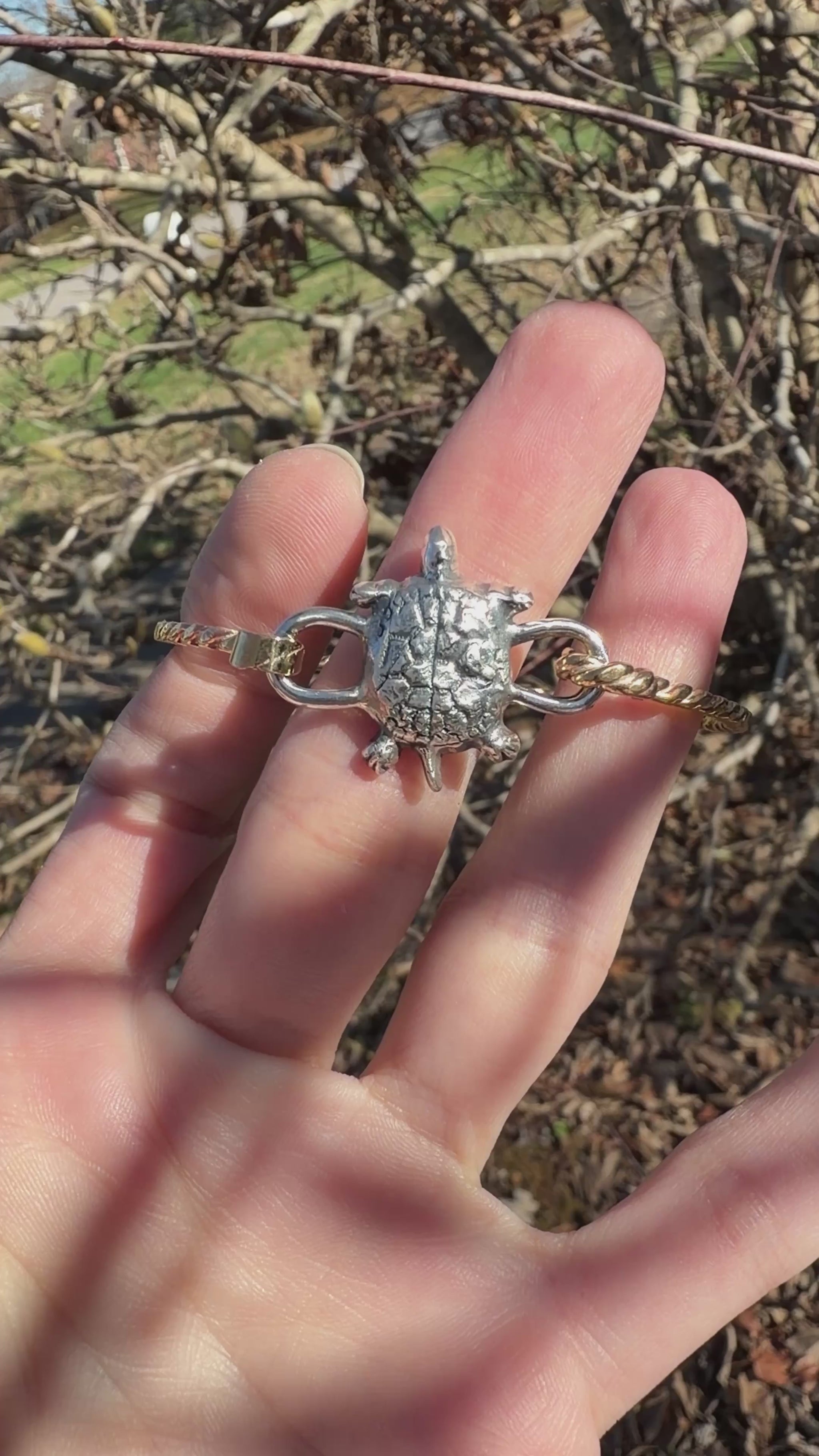 Hand formed brass wraps gently around the wrist. At the center rests a hand-sculpted turtle in fine silver clay—cast and finished with care. The bracelet is hinged clasp, sized at 7.25 around, and designed to evoke the feel of ocean-warmed metal. A simple form, but rich in touch and intention.