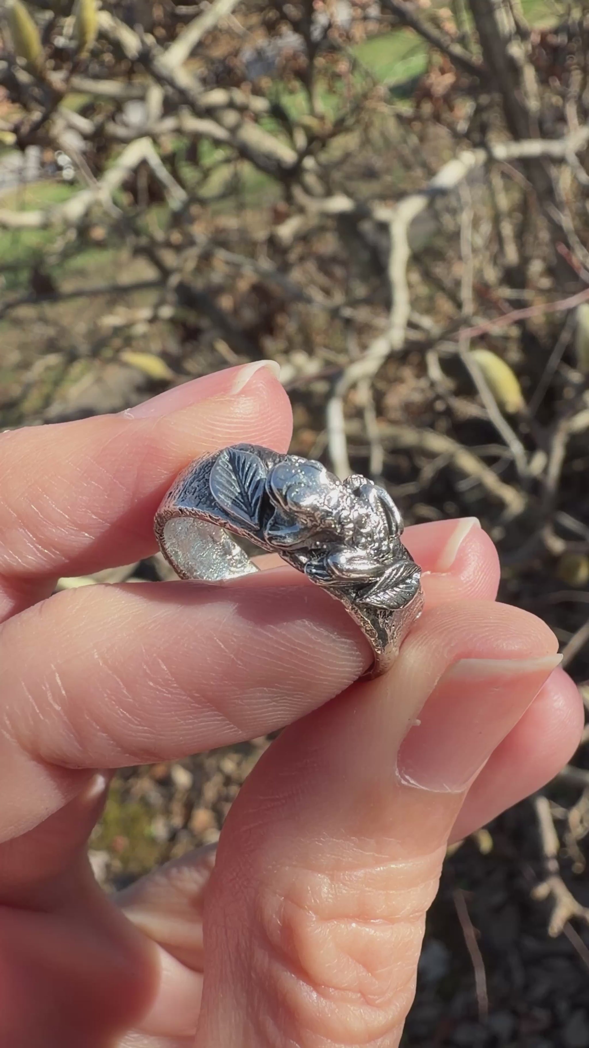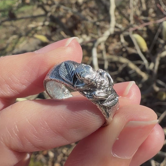 This ring brings together sculpted wildness and grounded silver. The band is hand-forged in sterling, textured with depth and intention. Perched atop it, a small frog rests among raised leaves—formed from fine silver clay using custom molds I made myself, then hand-shaped and torch-fired to solid metal.