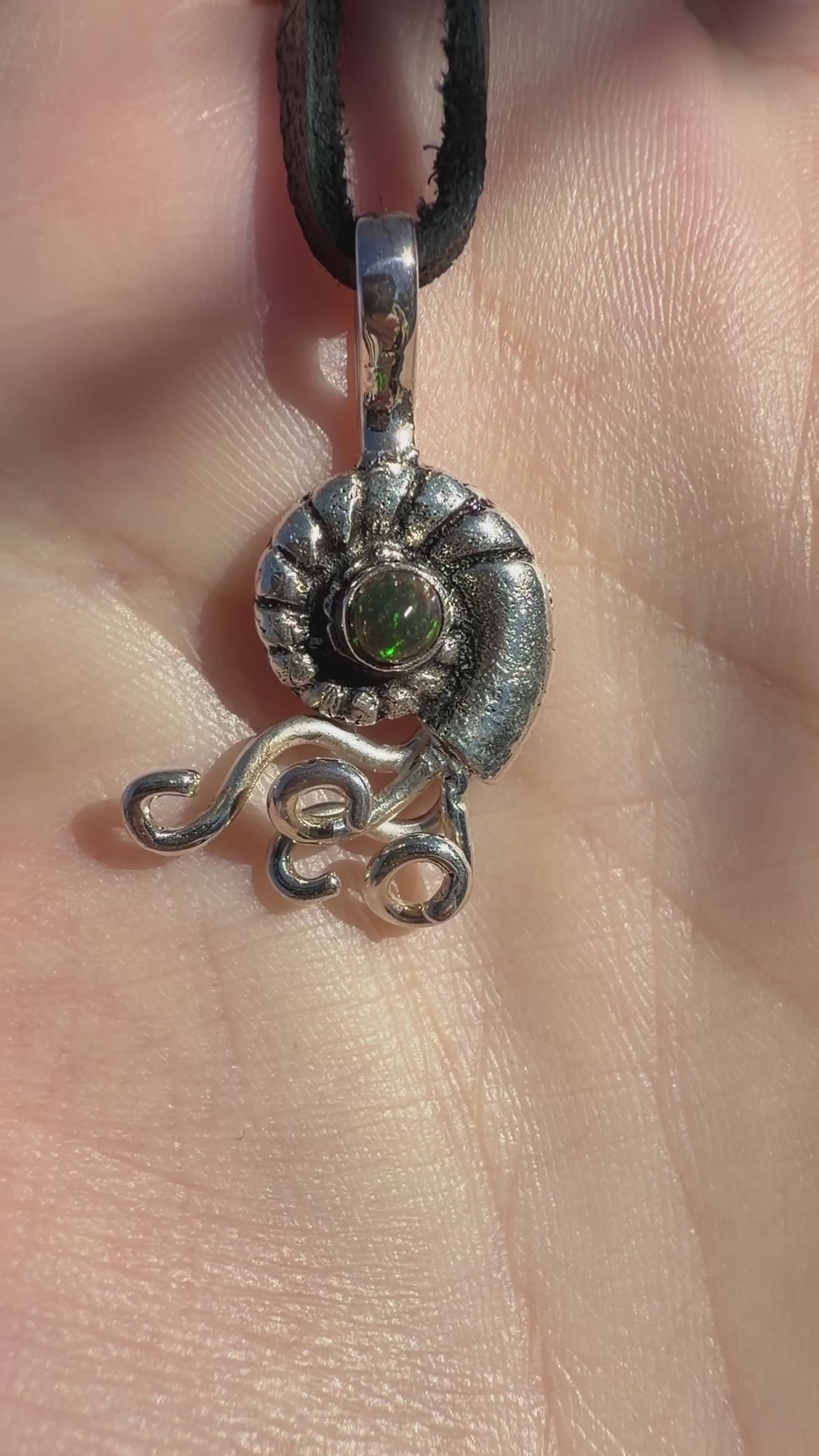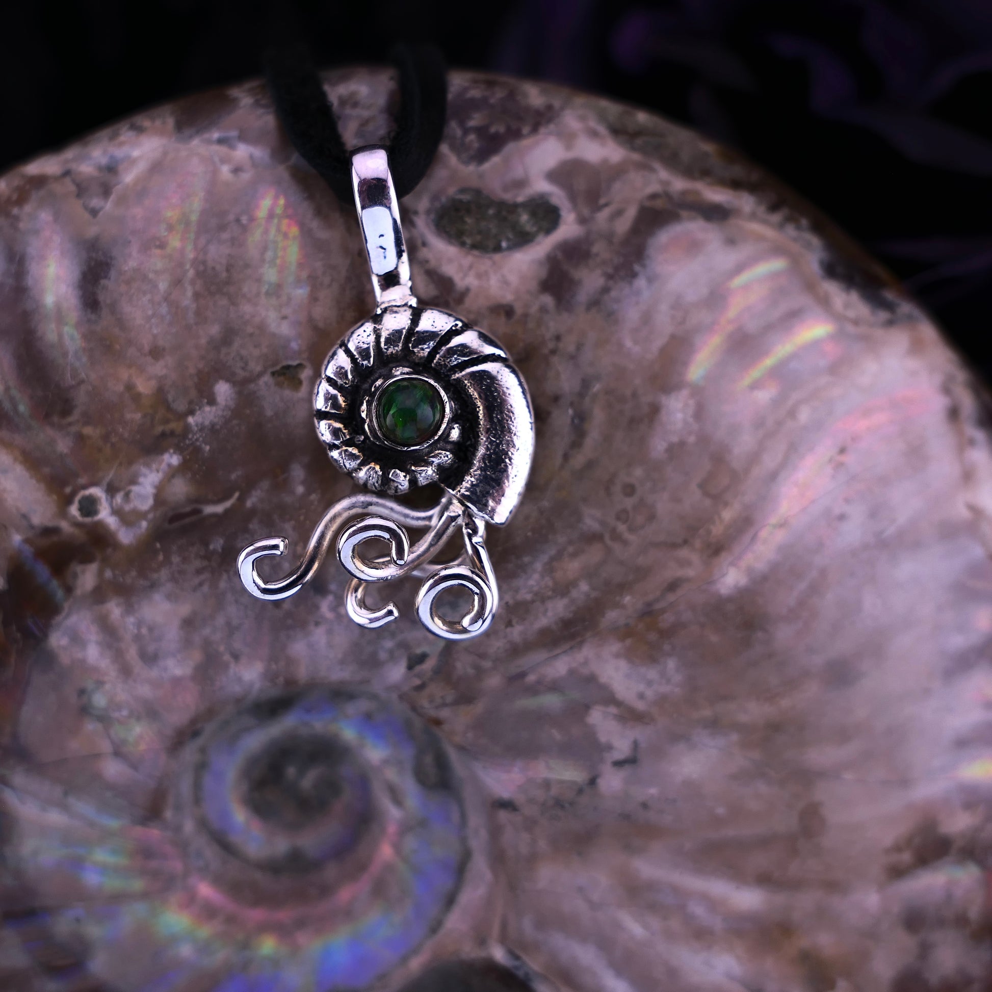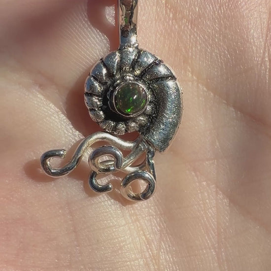 Born of tide and transformation, this ammonite pendant holds a tiny flare of ancient light. Sculpted in fine silver and darkened for contrast, its spiral form suggests deep-sea memory and fossil mystery—while the gleam of opal glints like a trapped green current.