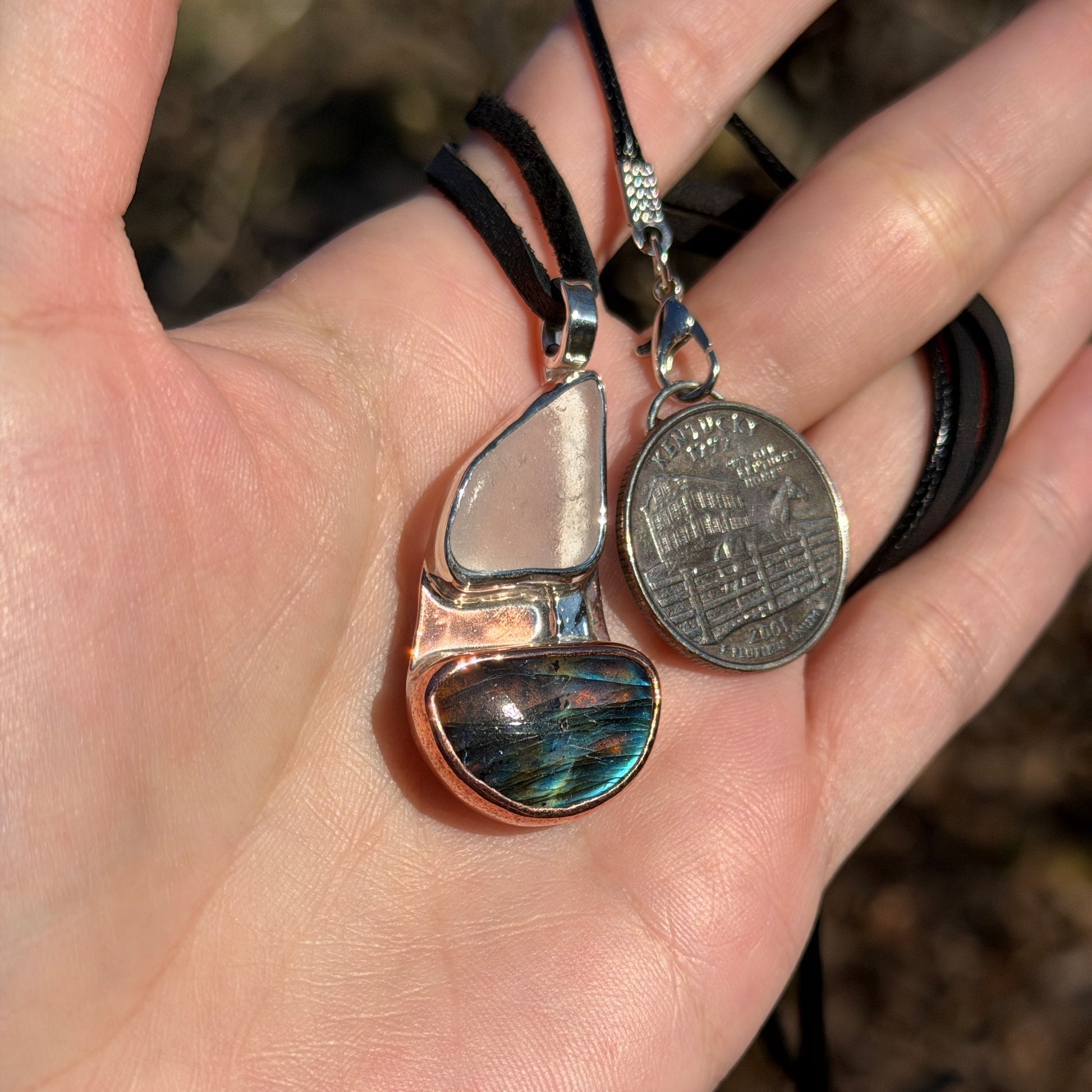 Materials: copper, sterling silver, Scottish sea glass, spectrolite, deer hide lace cord