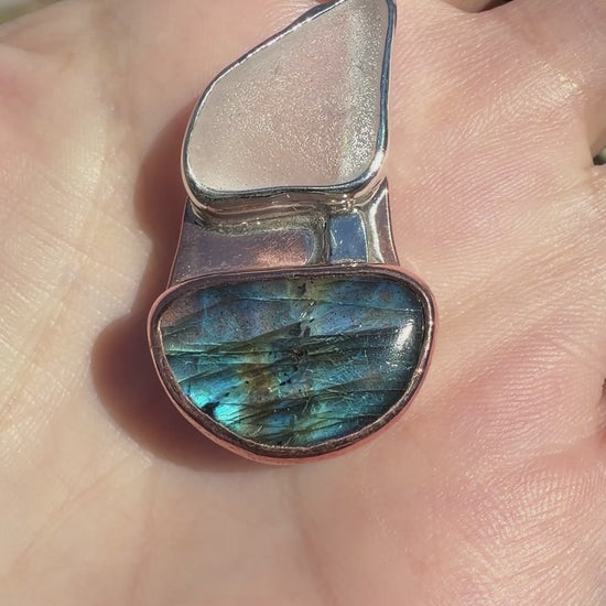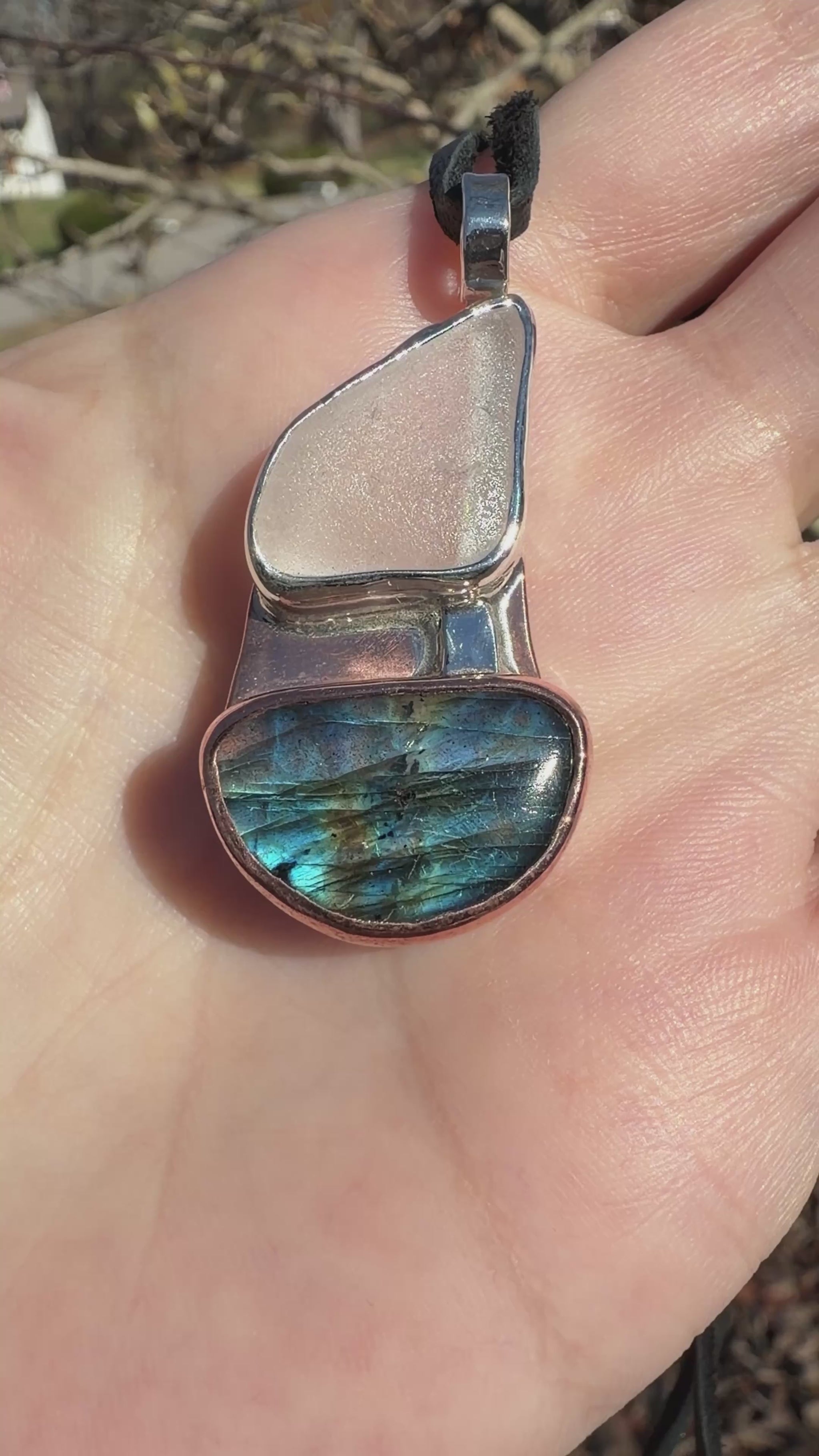 This pendant was shaped to look like a tiny boat in motion. The sail is Scottish sea glass, framed in sterling and left open in back so light can shine through. The hull is a moody piece of spectrolite, bezel-set in warm copper with flashes of blue and green. Together they form a stylized sailboat—organic, balanced, and made to move.